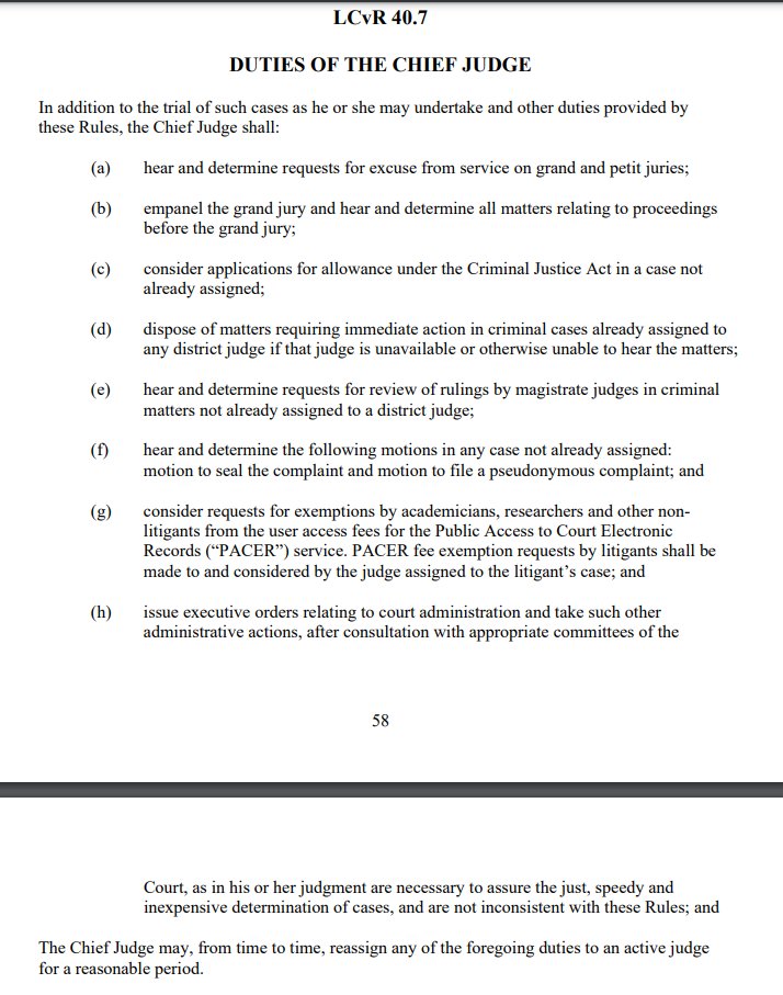 Each federal district court has its own local rules. In D.C., those rules provide that the chief judge's duties include the determination of "all matters relating to proceedings before the grand jury." 3/
