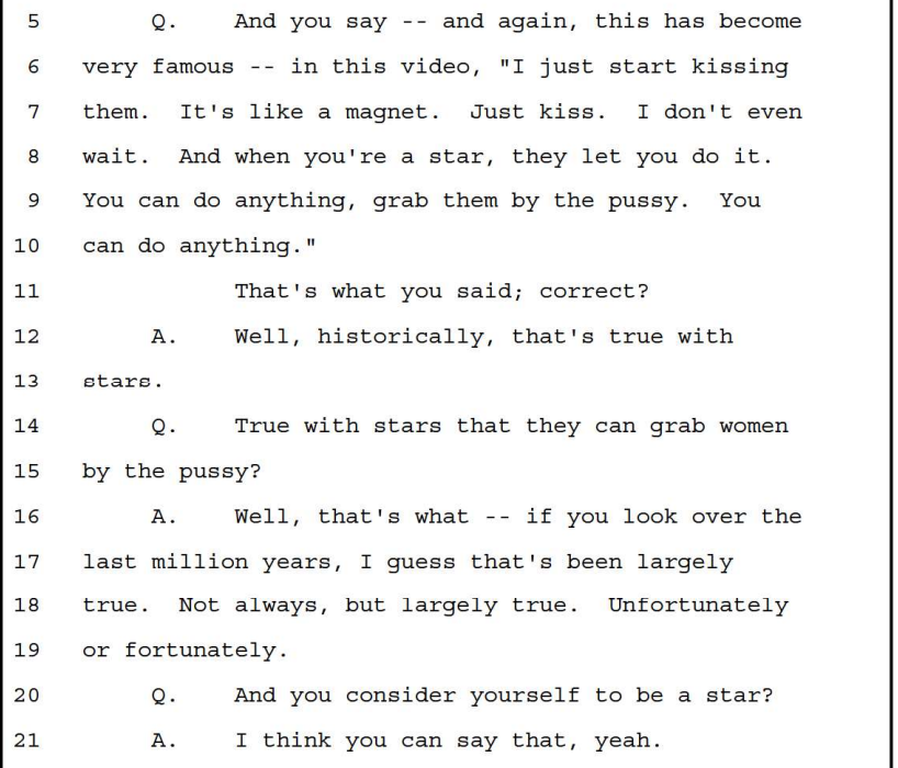 But where the central claim is whether he, in fact, raped Carroll, his explanation of that tape in this newly-released portion of the deposition suggests it is probably not just relevant, but a significant admission. 2/