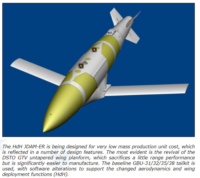 "The Key design objectives for the HdH (Hawker de Havilland now Boeing owned) product are lowest possible mass production cost, zero hardware changes to the existing GBU-31/32/35/38 tailkits, best possible performance, modularity, ease of