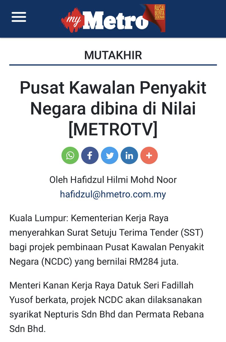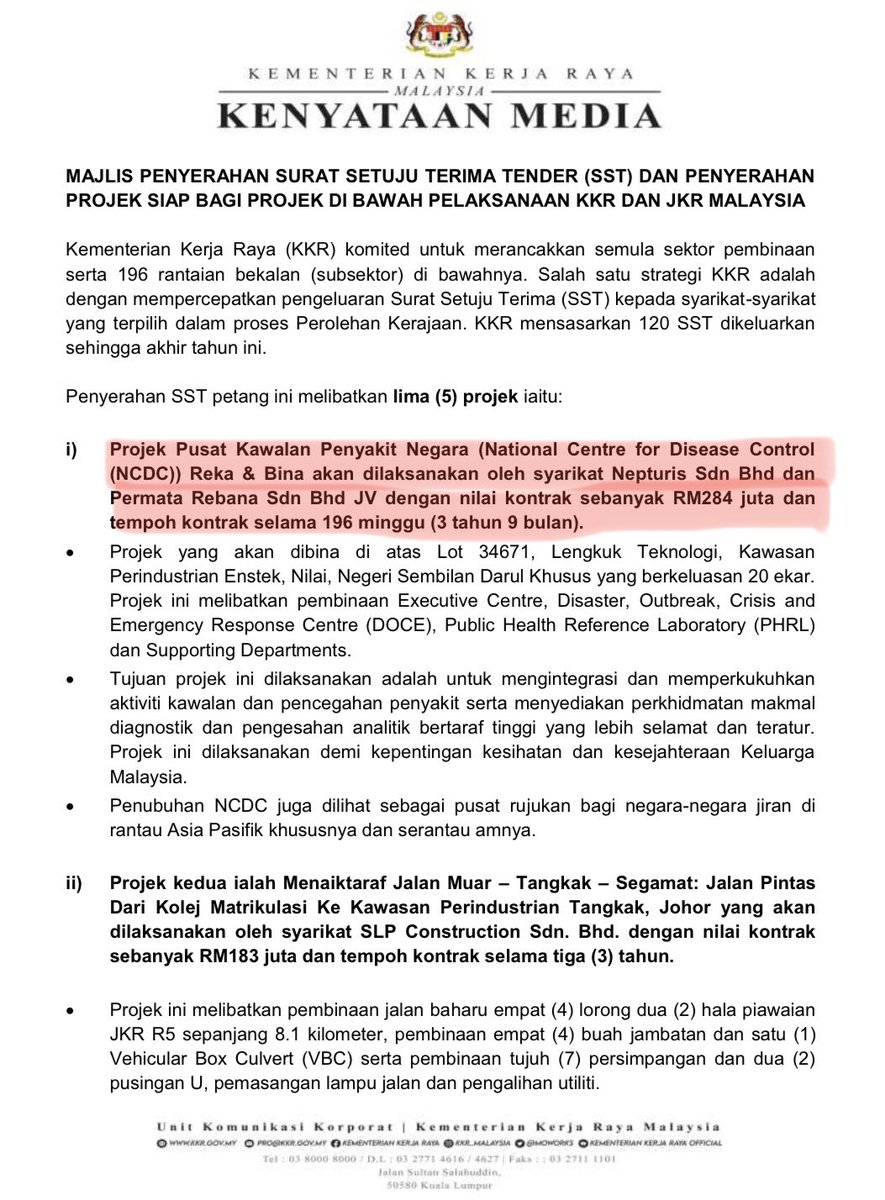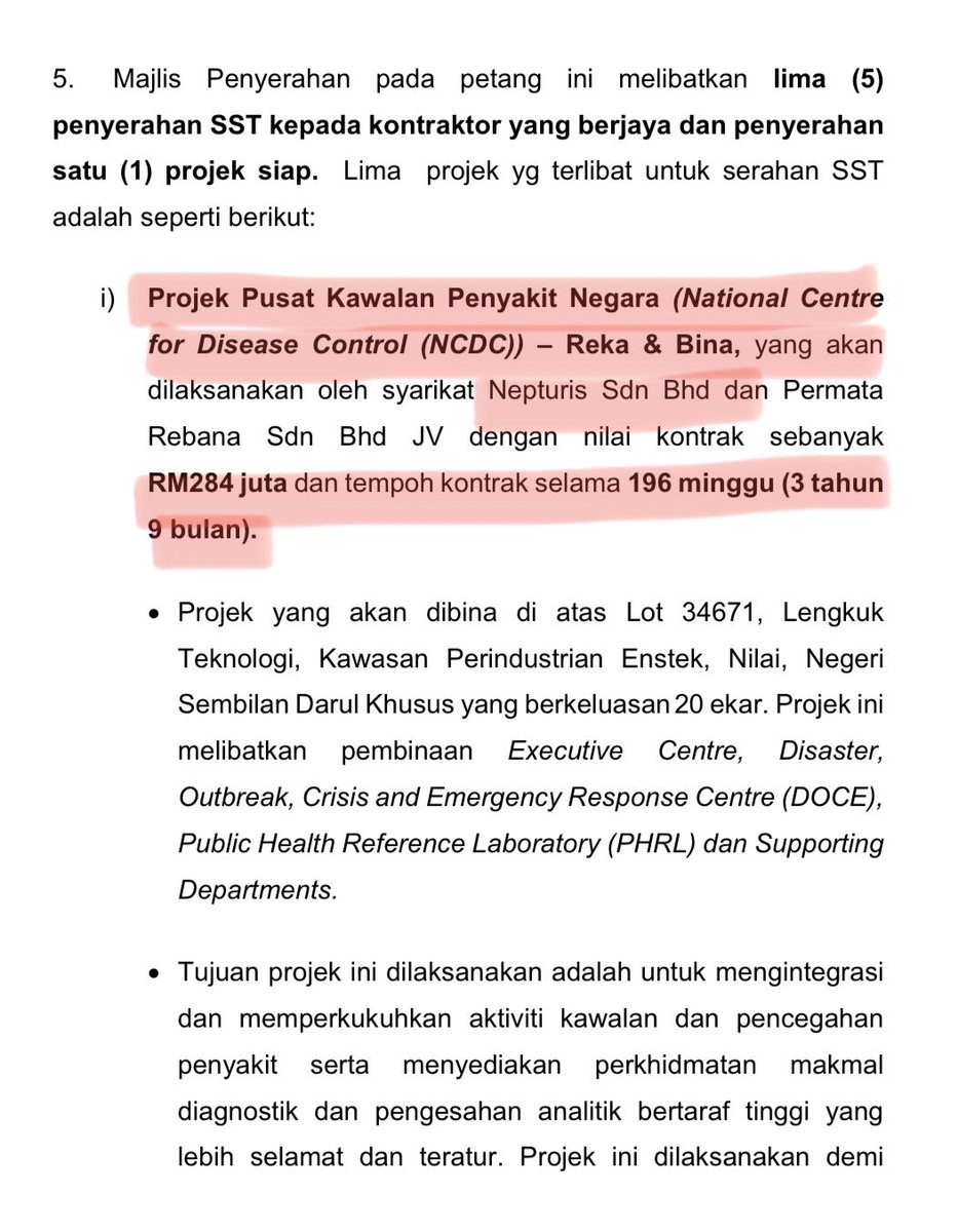 Apa yg menarik ialah, kami mendapati bahawa syarikat Bumiputera (Cina) ini - NEPTURIS SDN. BHD. juga sekali lagi 😜 mendapat surat setuju terima tender (SST) utk membina Pusat Kawalan Penyakit Negara (NCDC) bertempat di Nilai, Negeri Sembilan yg berjumlah RM284 juta.