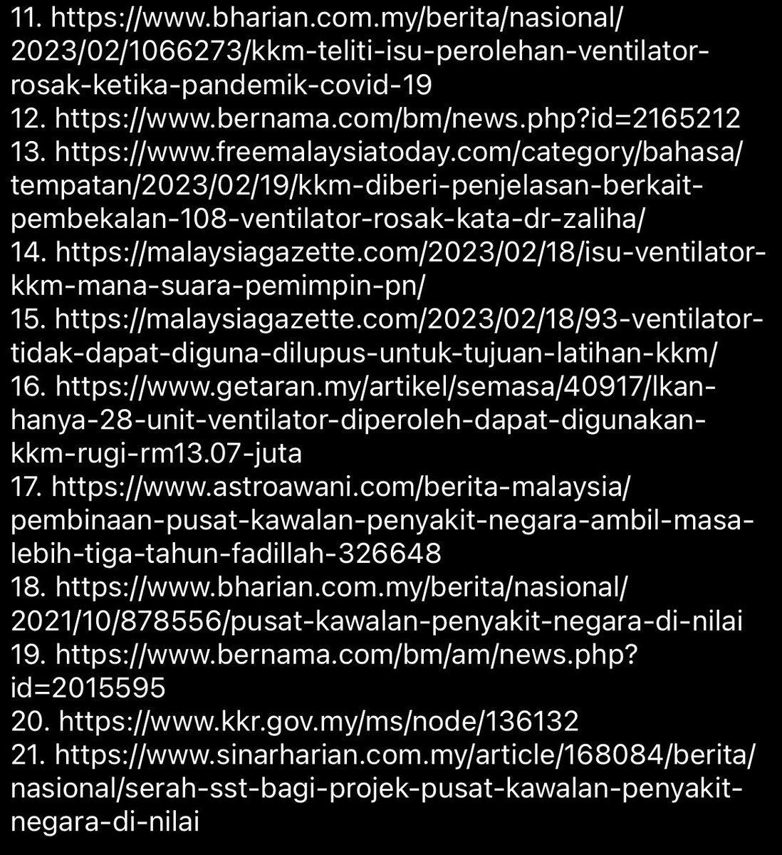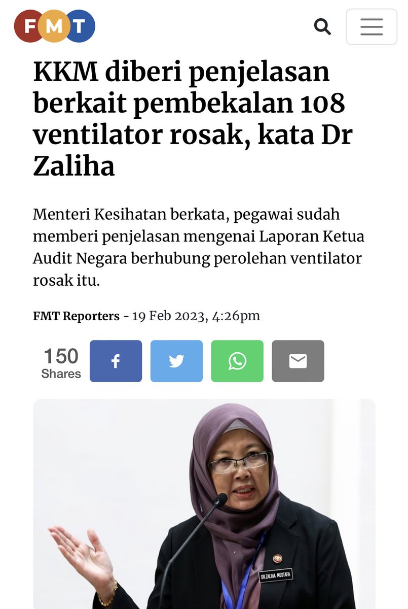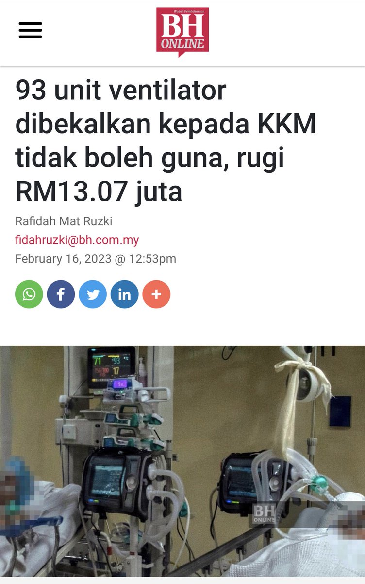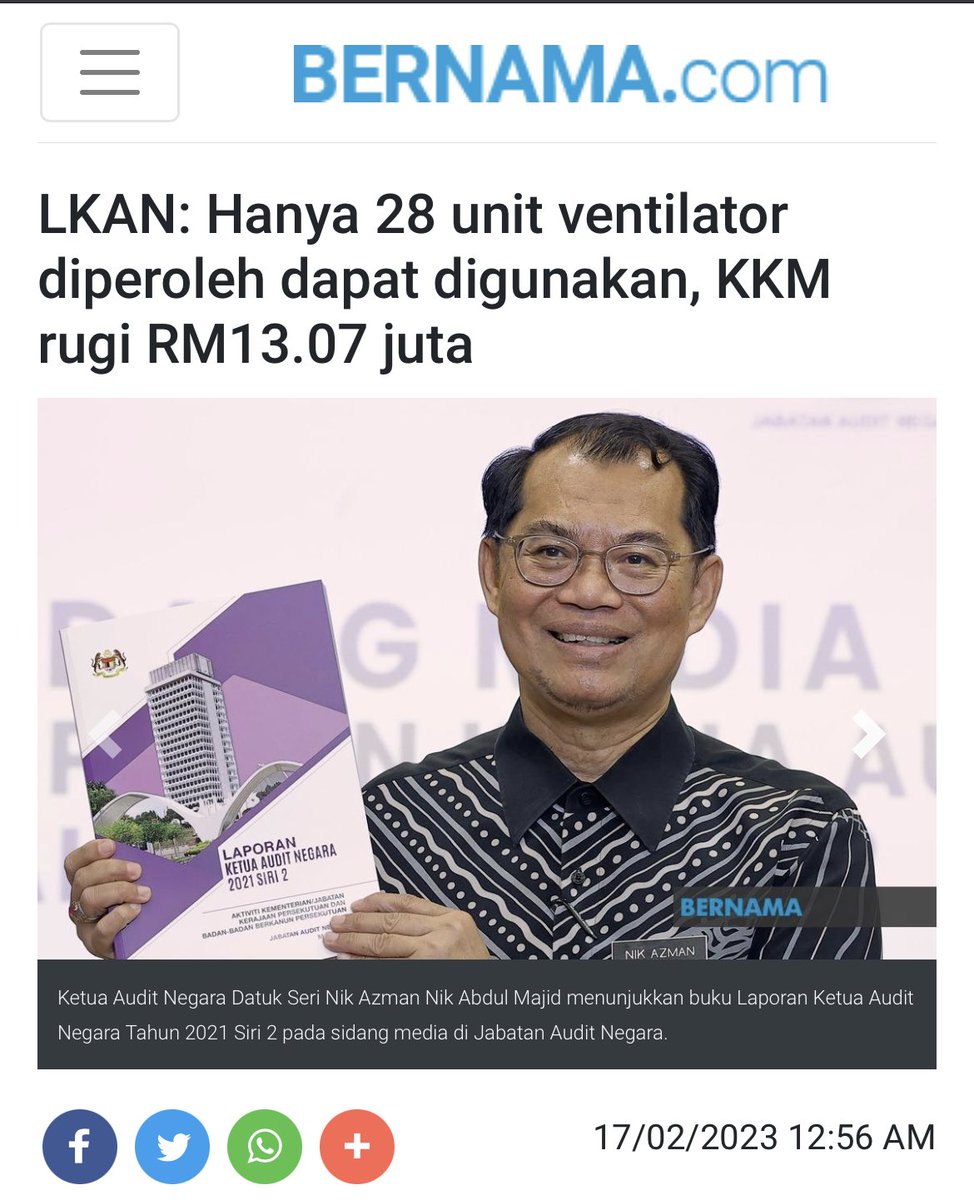 Baru-baru ini kita terima laporan bahawa terdapat beberapa masalah tadbir urus bg perolehan Kementerian Kesihatan terutamanya mengenai 108 ventilator yg rosak/x dapat diguna. Laporan dari Ketua Audit Negara bertarikh 17/2/2023 yg mengalami kerugian sekitar RM13.07 juta.