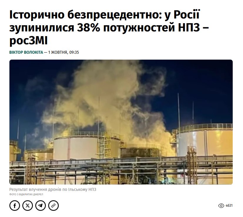 Ukraine continues its kinetic sanctions. The Russians admit: 38% of refining capacity has been shut down.