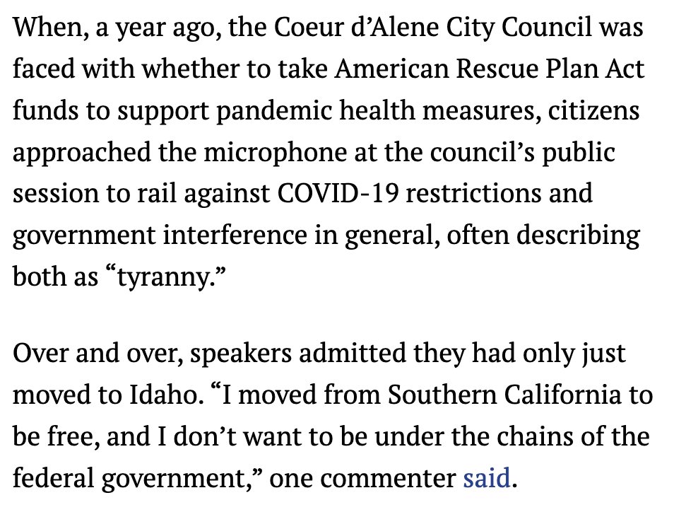 Lots of conservatives in blue states fumed over COVID restrictions, and sought refuge in places like Idaho, a red state that drew national attention for churches outright *refusing* to close.