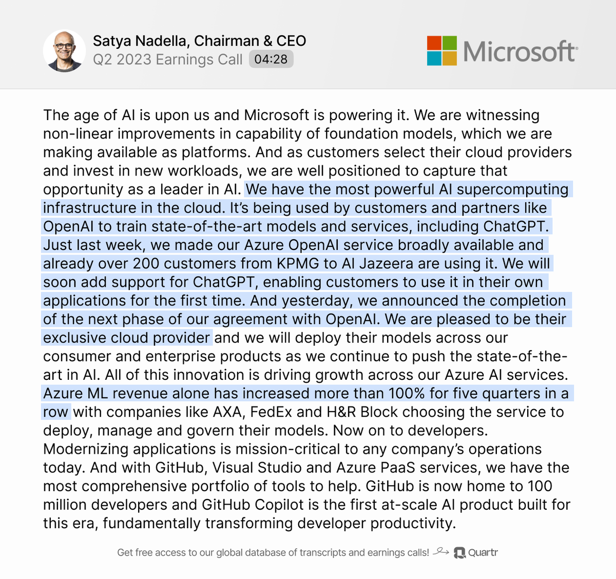 3. $MSFT is the exclusive cloud provider of OpenAI and Azure's ML revenue has more than doubled for five quarters in a row: