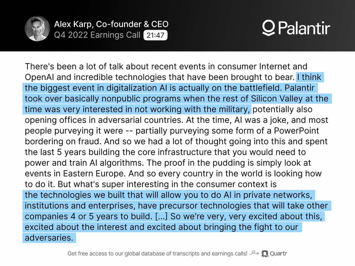 $PLTR is up 16% today after reporting its first-ever GAAP profitable quarter yesterday. In this thread, we have compiled a 10 key quotes and slides from the earnings call 🧵