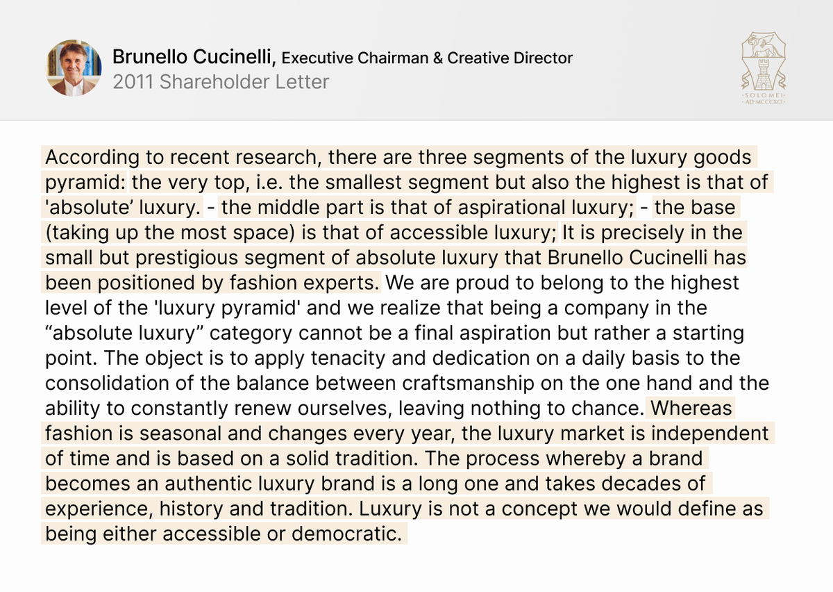 In his first shareholder letter published in English, Brunello talks about the luxury pyramid, and $BC.MI's positioning: