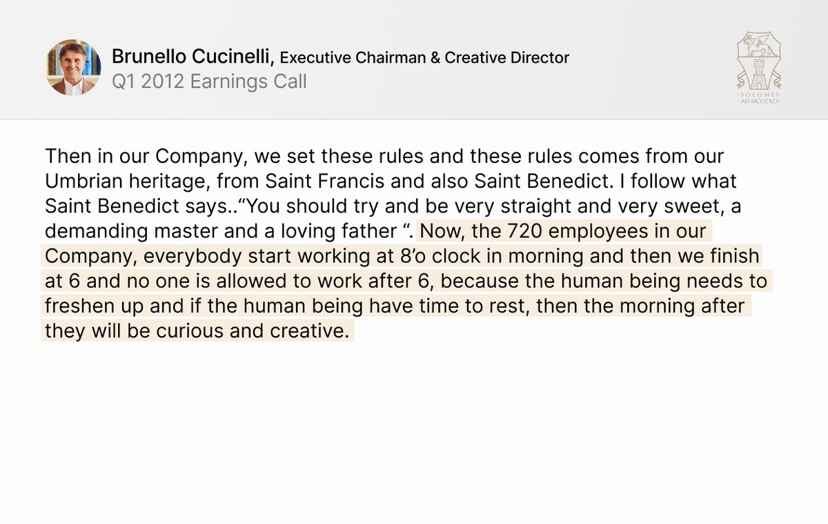 Brunello Cucinelli, known as the King of Cashmere, runs his Italian luxury design house $BC.MI in a very fascinating way.