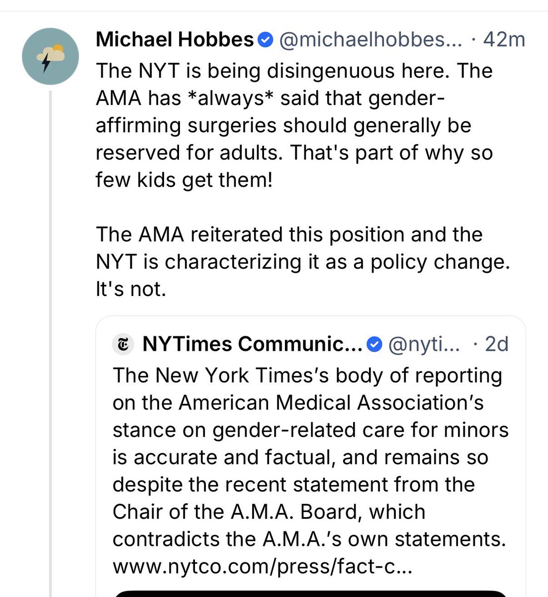Hobbes fails to understand that the original reporter who published the AMA’s statement saying it sided with the ASPS on youth gender surgeries was not Jeremy Peters, it was Andrew Jacobs, who could in no way be considered a part of this supposed “anti-trans braintrust.” Peters was only reiterating what Jacobs originally reported.