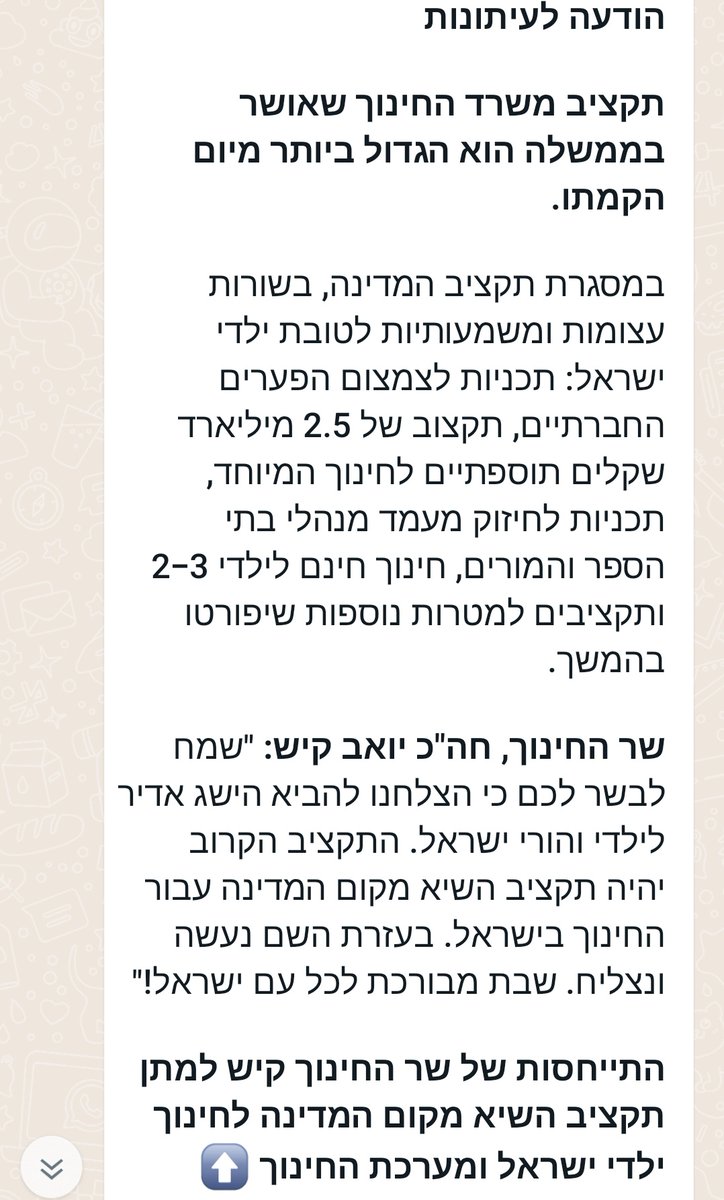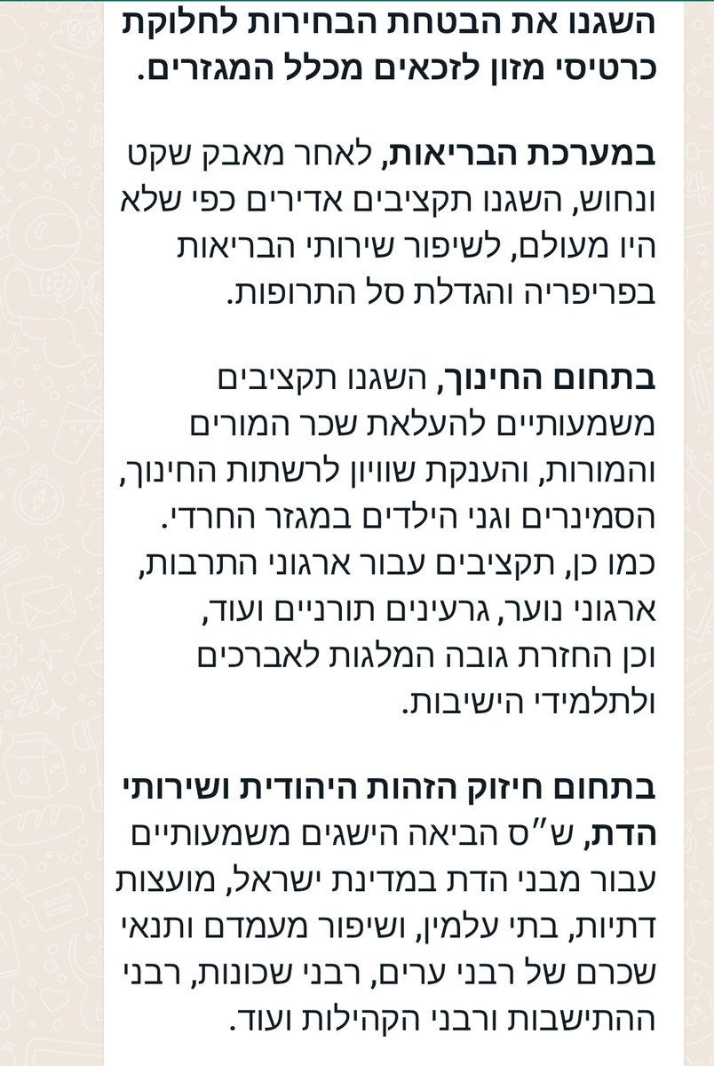 משרד ה________ בראשתי דאג שכל _______ ו-______ ייהנה מתקציב בו נוכל לממש את התכניות וההבטחות שלנו. הצלחנו להגדיל את תקציב משרד ה________ ב_______. זו בשורה גדולה וחשובה לעם ישראל.