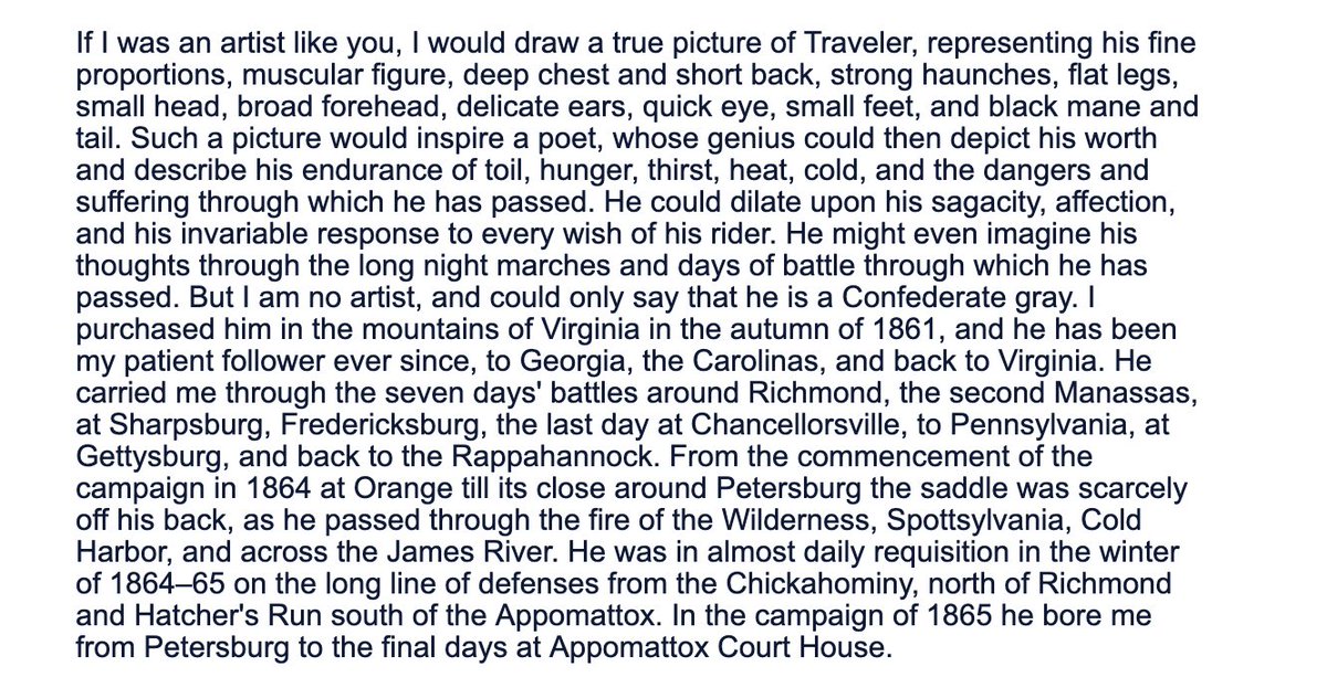 Traveller grazed on the campus of Washington College during Lee's final years. Displaying his tenderness for the animal, Lee described him to a painter this way :