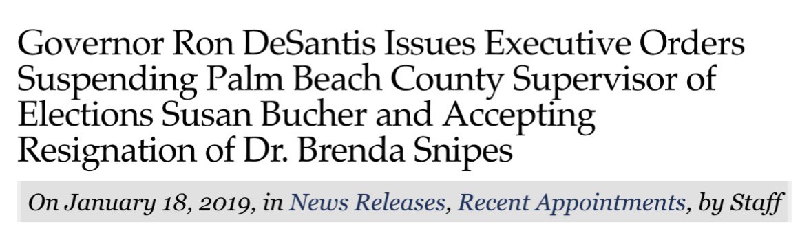 If the 2018 election was legit as DeSantis wants us to believe, why did he suspended Susan Bucher, the supervisor of Palm Beach County, and accepted the resignation of Brenda Snipes, immediately after he got sworn in? Scared that they might steal his election in the future?