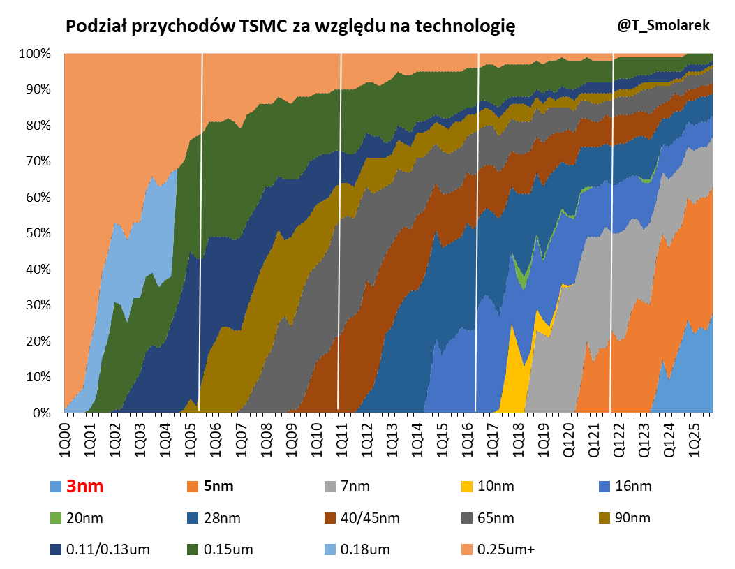 ▶️ Samo TSMC powoli redukuje swoją ekspozycję na starsze technologie, głównie te faktycznie schyłkowe, by uwolnić miejsce i zasoby na wyspie (Tajwan) pod nowsze rozwiązania. Dlatego trend na przychodach na dojrzałych technologiach może nie do końca oddawać aktualne dynamiki na szerokim rynku w tym segmencie.