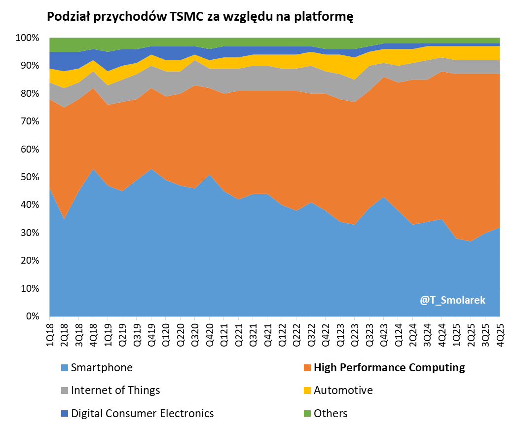 ▶️ Ich łączny udział w przychodach w 2025 wyniósł 87%, z czego HPC 58% (51% w 2021), a smartfony 29% (35% w 2023).