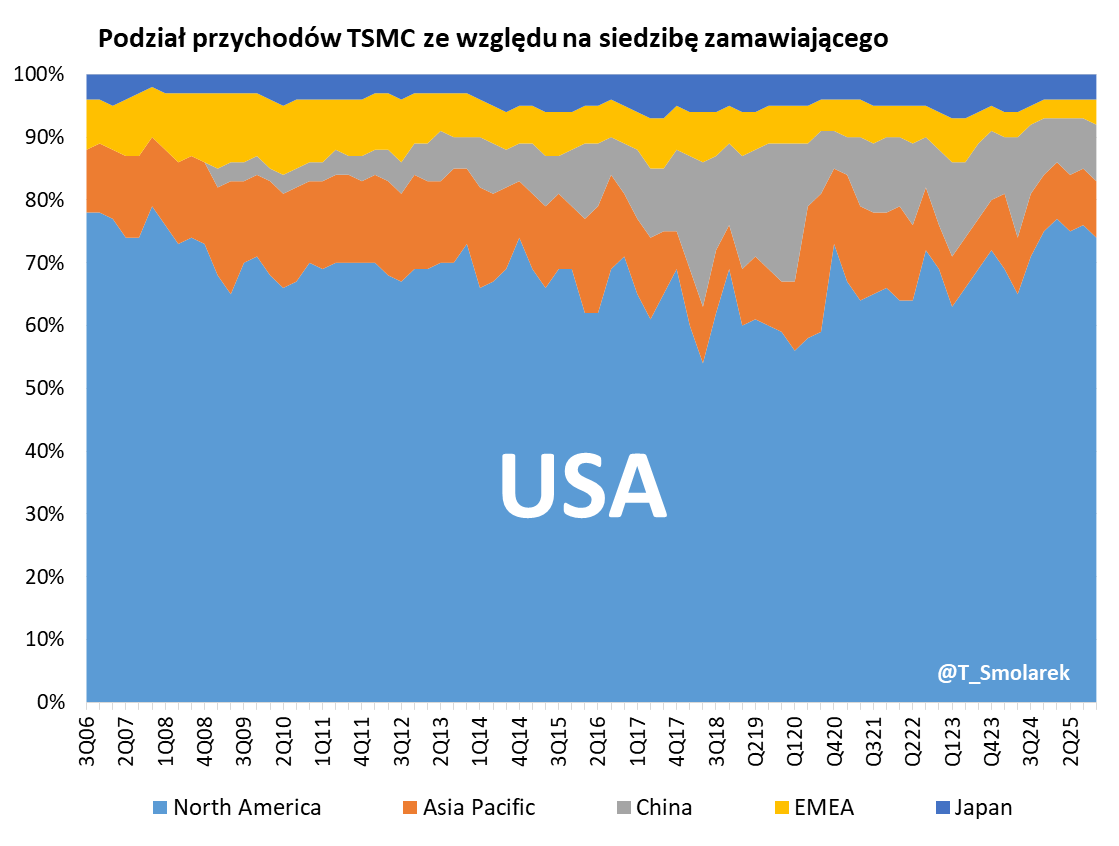▶️ Udział Amerykanów 🇺🇸 w przychodach TSMC w 4Q'25 wyniósł 74% względem 76% w 3Q oraz 75% rok wcześniej. W całym 2025 roku udział USA to 75% (70% w 2024 i 68% w 2023).
