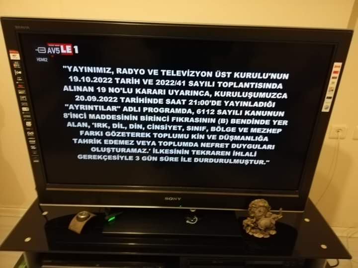 uyarınca, kuruluşumuzca: 20.09.2022 tarihinde saat: 21.00 de yayınladığı 'AYRINTILAR' adlı programda: 6112 Sayılı Kanun'un: 8.maddesinin 1'nci fıkrasının (b) bendi'nde yer alan: 'IRK, DİL, DİN, CİNSIYET, SINIF, BÖLGE VE MEZHEB AYIRIMI GÖZETEREK, TOPLUMU KİN VE DÜŞMANLIĞA TAHRİK
