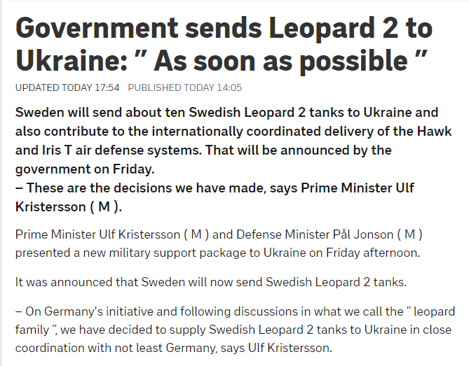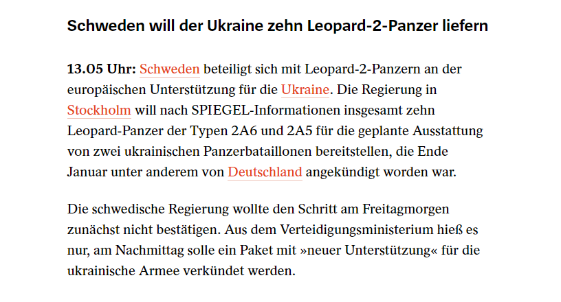 Spiegel reports that Sweden wants to hand over 10 Stridsvagn 122, an upgraded version of the Leopard 2A5 with additional armor and grenade launcher.
