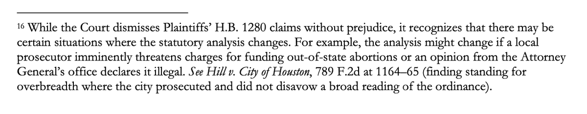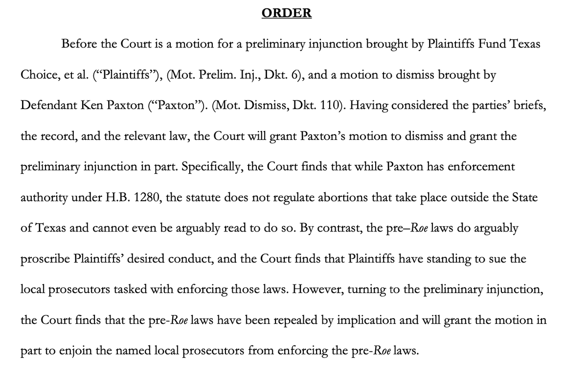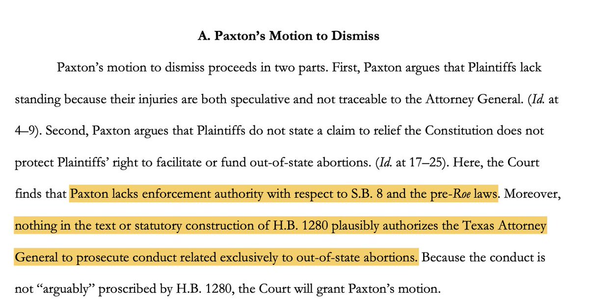 While Paxton was dismissed from the suit, it's important to see why: Pitman ruled that Paxton had no enforcement authority under the pre-Roe laws or SB8 and that HB1280 does not even "arguably" allow prosecutions related to out-of-state abortions.