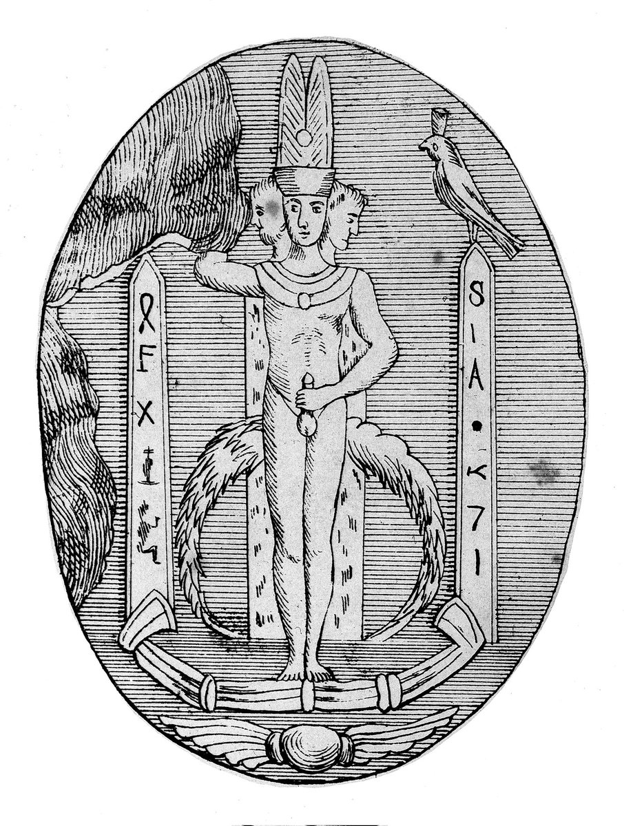 Knight continues, "In this composition they represented the generative power of the Ερως [Eros], Osiris, Mithras, or Bacchus, whose centre is the Sun. By the inscription on the pedestal, the attribute thus personified, is styled 'The Saviour of the World'."