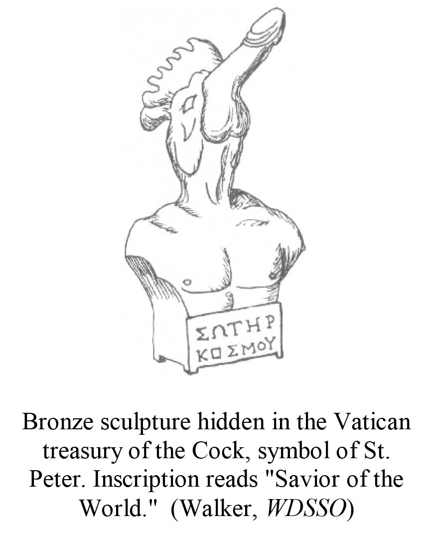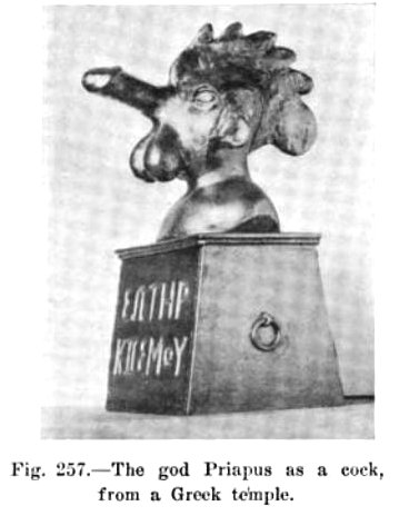 In Richard Payne Knight's 'On the Worship of Priapus' he writes, "The celebrated bronze in the Vatican has the male organs of generation placed upon the head of a cock, the emblem of the sun, supported by the neck and shoulders of a man."