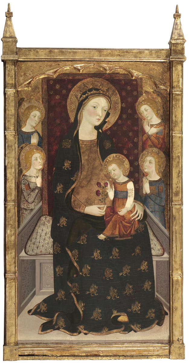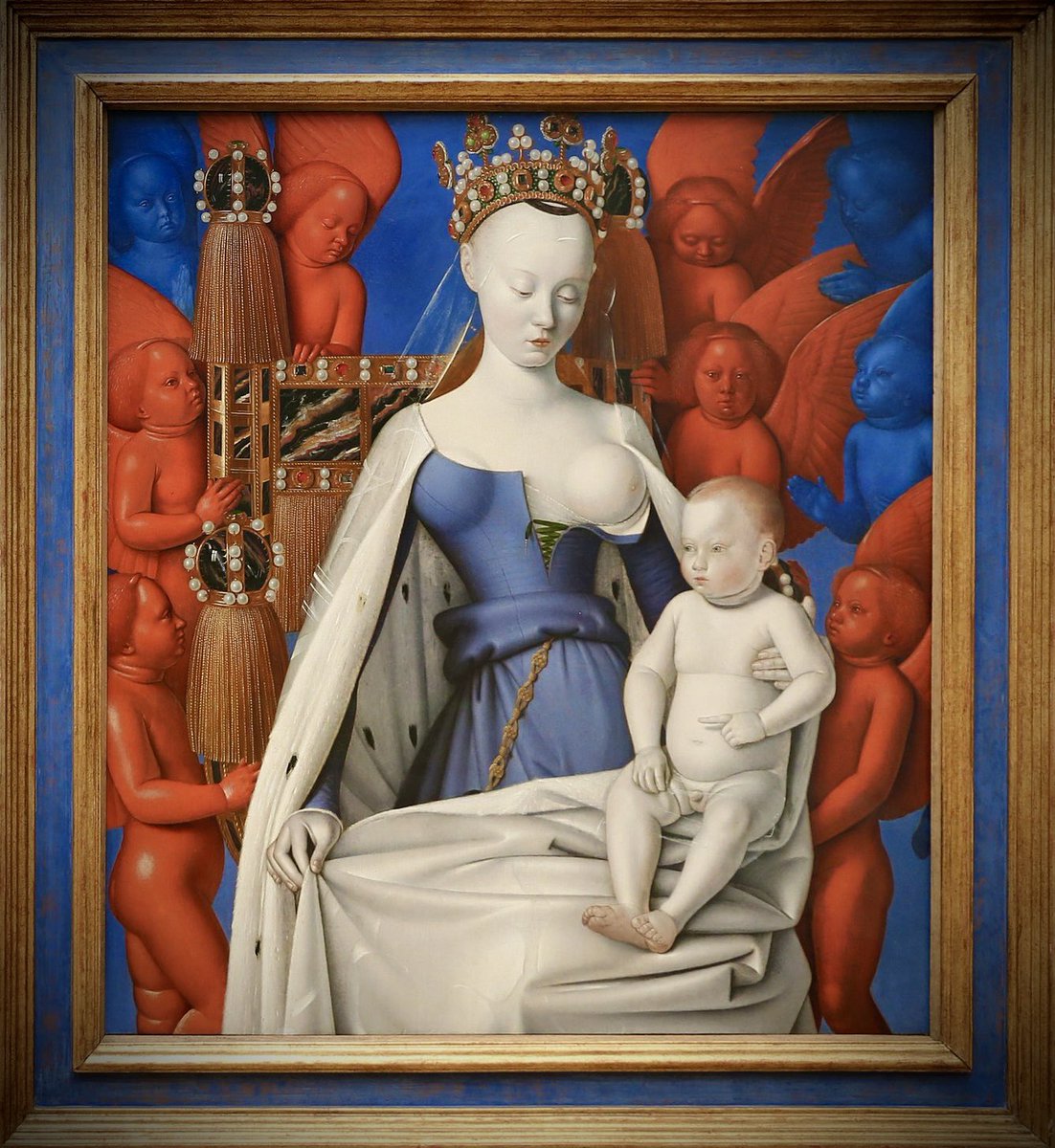 Que la Virgen muestre un seno no es inusual, siendo una Madonna Lactans. Pero ni amamanta al Niño, ni su aspecto es quizá el esperable. Esbelta, sensual, elegante, con labios carmín, cejas y sienes afeitadas, a la moda borgoñona del siglo XV. Más parece una distinguida cortesana.