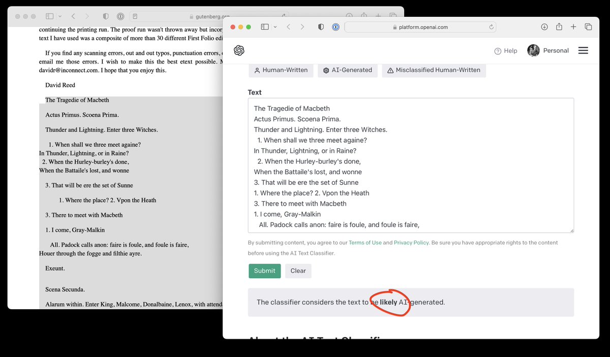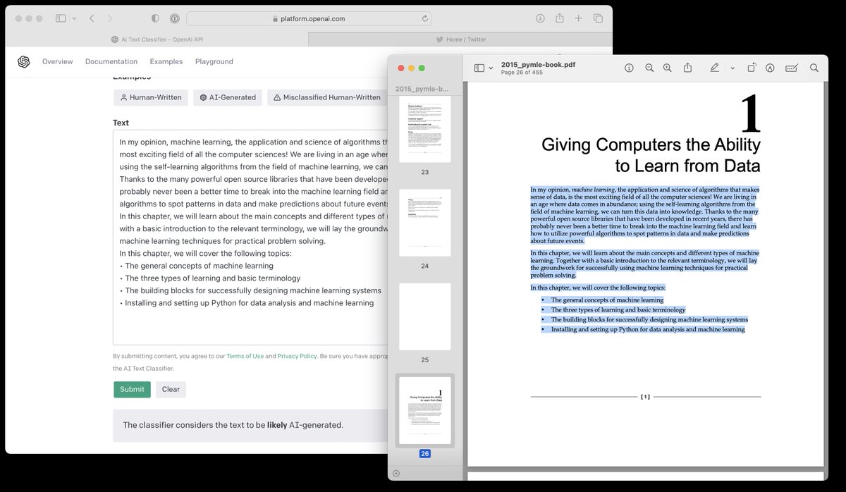 (1) AI Classifier: a GPT model fine-tuned via supervised learning to perform binary classification -- the training dataset consisted of human- & AI-written text passages. The probas [0, 1] are thresholded to obtain the four categories.