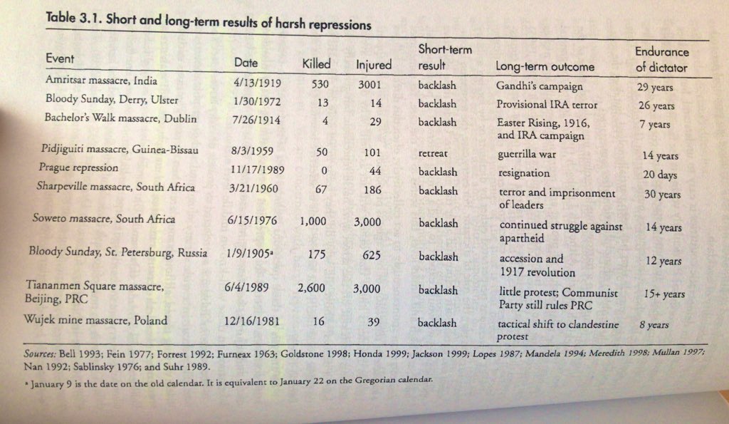 2/En una estructura Represión vs Movilización como la que aquí se presenta, el dilema del dictador es: ¿Cuanta represión es suficiente o necesaria para disuadir el descontento sin que ésta cause un contragolpe o mayores niveles de movilización? El fallo es un contragolpe