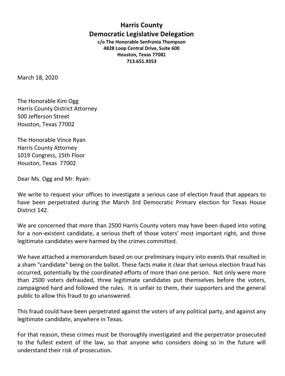 Remember when @GeneforTexas@Senfronia4Texas who pressured Harris County District Attorney Kim Ogg into investigating the "ELECTION FRAUD" that they claimed took place in the Tuesday, March 3, 2020, Democratic Party Primary race for House District 142?