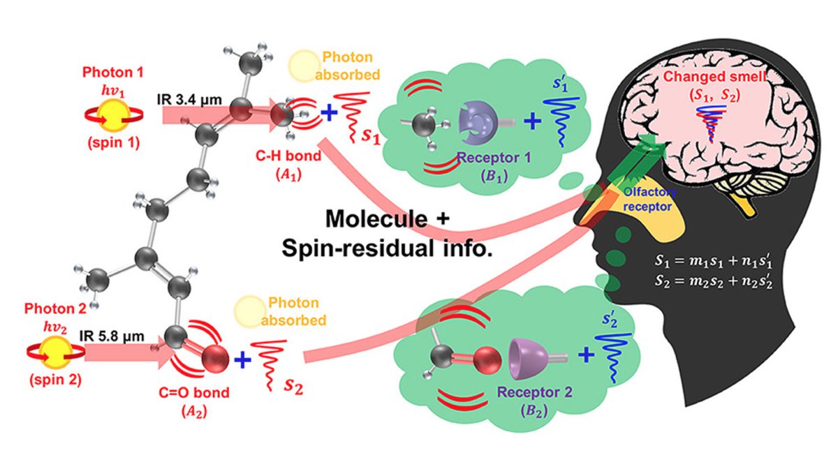 37. Recently researchers (2020) used infrared light to excite the molecular bond oscillation in odor molecules. As the molecules absorb the light, they begin to oscillate and emit an infrared photon, which contains spin-residual information.