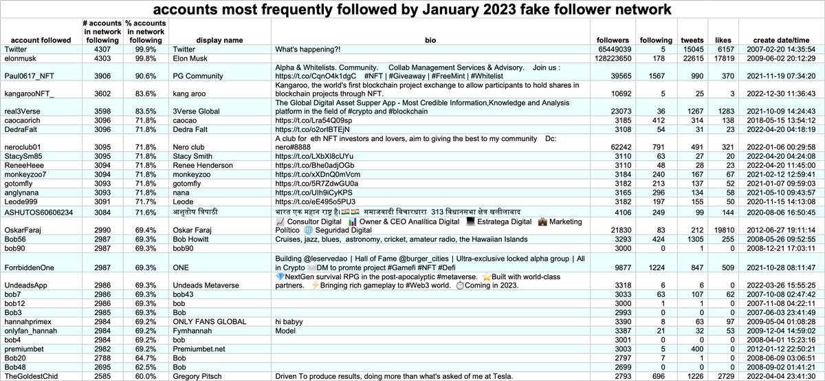 Who does this fake follower botnet follow? Primarily two categories of account: crypto/NFT accounts and (mostly abandoned) accounts belonging to people named "Bob". 99% of the accounts in the network also follow both @Twitter and @elonmusk.
