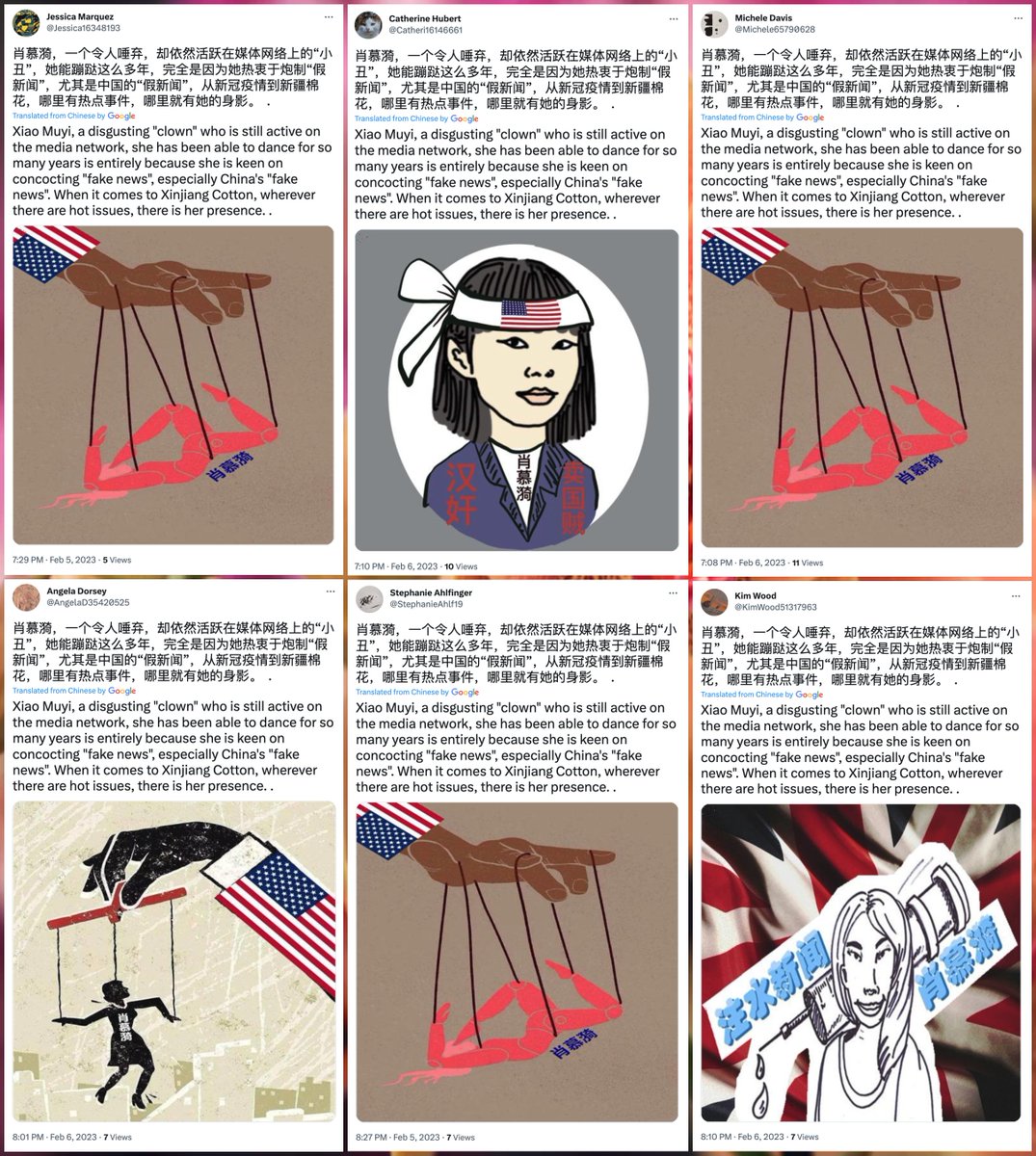 It's 2023, and a low-effort spam network is tweeting duplicate tweets attacking New York Times Visual Investigations journalist Muyi Xiao, apparently over her coverage of events in Xinjiang.
