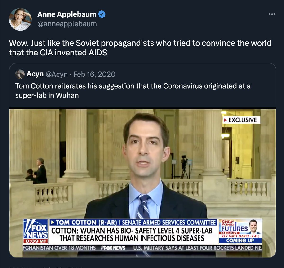 Yesterday, I called out Applebaum, an Atlantic journalist, for smearing lab leak proponents. I was also curious whether she influence GDI's efforts to blacklist news sites that engaged in lab leak talk.