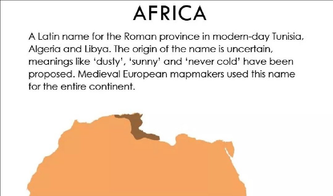 Le terme Afrique est d'origine Amazigh. Il désignait une région de l'Afrique du Nord (≈Tunisie) puis l'ensemble de l'Afrique du Nord mais aussi une divinité (ifri) et une tribu (Ayt Ifren). D'où la célèbre phrase de Massinissa, un roi Amazigh "l'Afrique aux Africains".