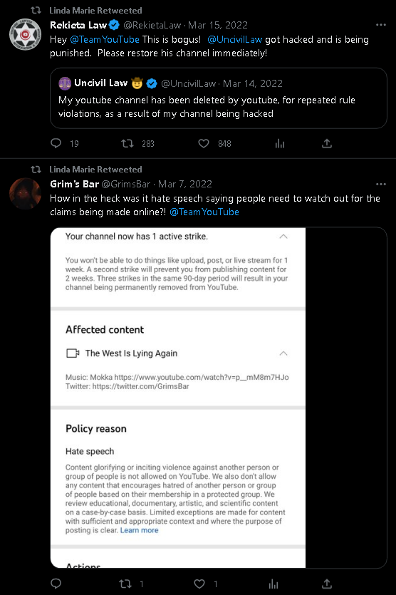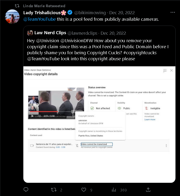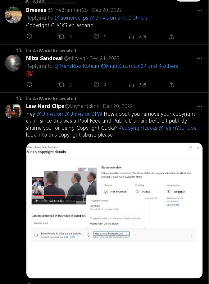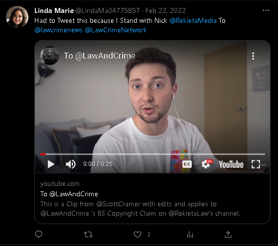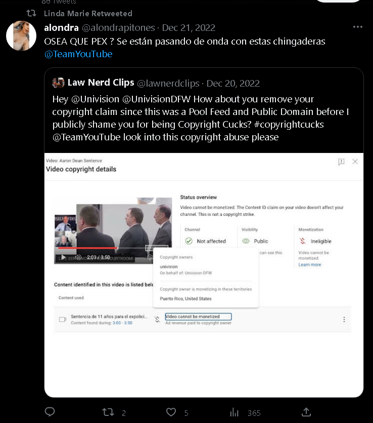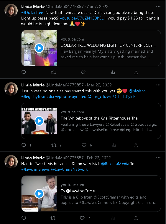 Again we find another example of @lawnerdclips posting her youtube videos to her other twitter account @LindaMa04775857. Remember this is the same one she was retweeting her main account on when she got copyright stuck.