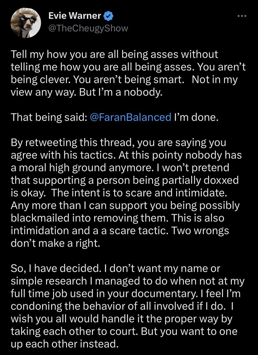 Evie Warner thecheuglyshow is done with copystriker @FaranBalanced and now she is simping hard after her followers went up after she got injected into the drama. Typical