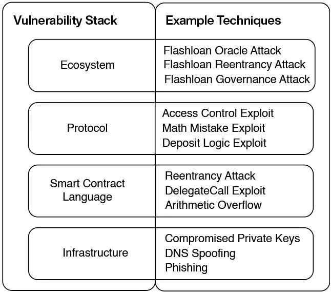 3/ The most common web3 security attack surfaces can be categorized into four layers: infrastructure, smart contract language, protocol logic, and ecosystem