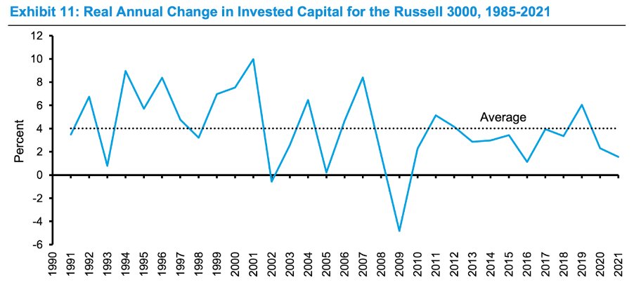El crecimiento promedio del capital invertido, después de ajustar por inflación, fue del 4%. Esta definición de capital invertido elimina el exceso de efectivo. Las empresas generan más efectivo del que invierten.