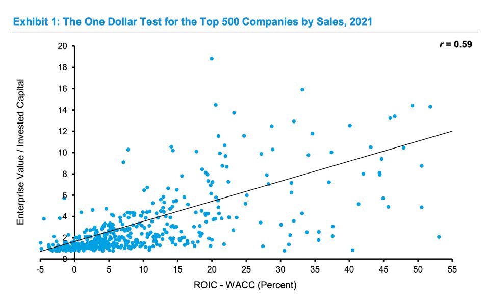 Los académicos han descubierto que este es el caso. El siguiente gráfico muestra que esta correlación, aunque no es perfecta, es una forma útil de demostrar que el mercado se preocupa por el ROIC.