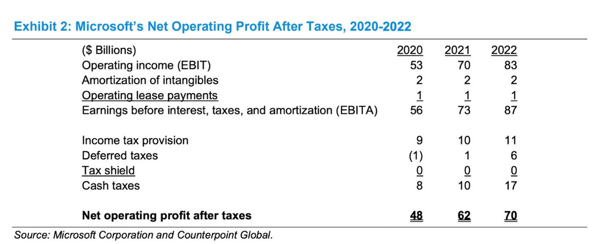 Aquí calculamos el NOPAT de Microsoft $MSFT. Para el año fiscal 2022 de la compañía, el EBITA es de $87 mil millones y los impuestos en efectivo son de $17 mil millones, lo que deja un NOPAT de $70 mil millones.