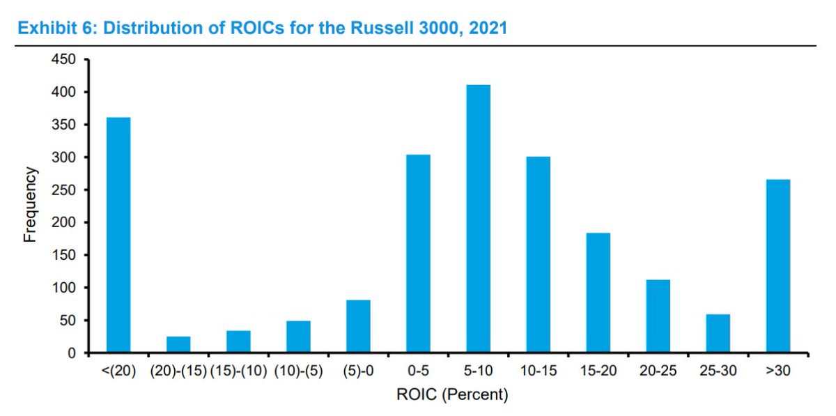 Aquí vemos la distribución de los ROIC para el Russell 3000 en 2021. La moda es un ROIC de 5 a 10%. Pero casi el 30% de la muestra se encuentra en los extremos de un ROIC de -20% o menos o 30% o más.