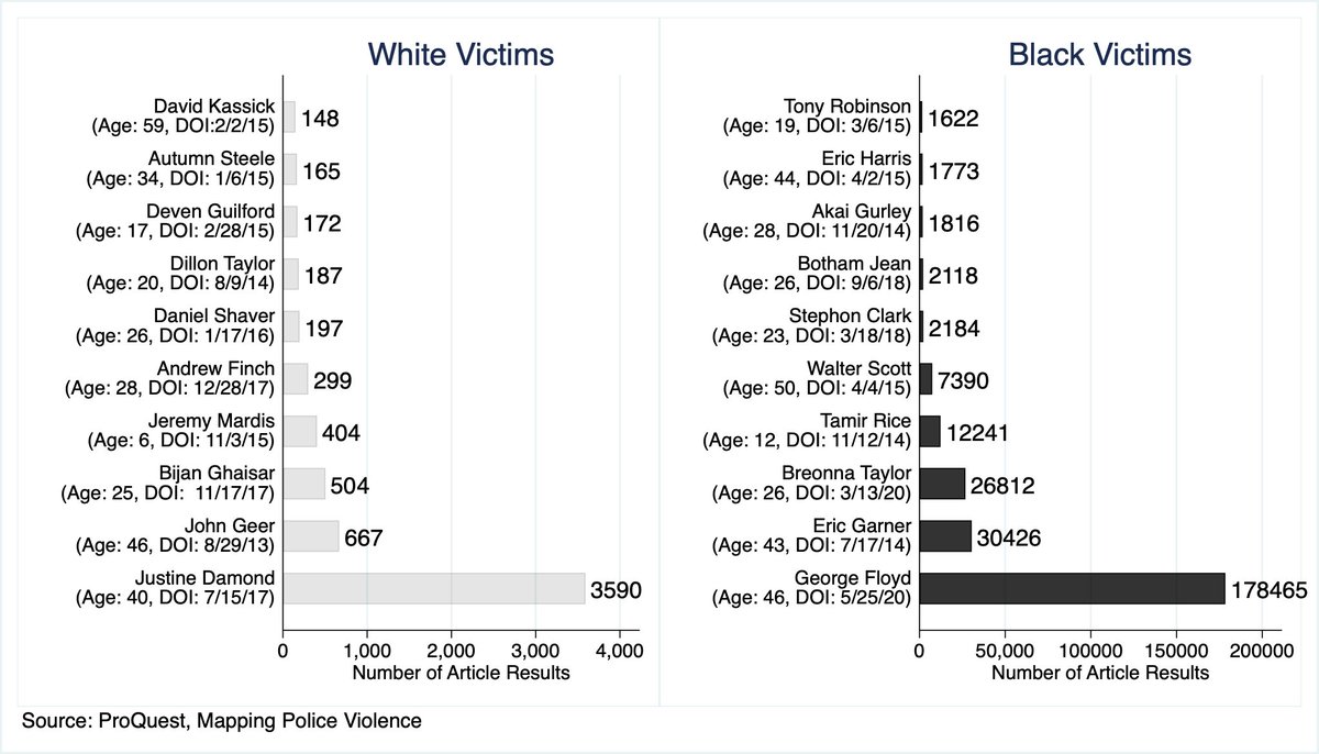 This chart quantifies some of it: Unarmed white victims of police violence get only a *tiny* fraction of the news coverage that black ones do — maybe about two to three percent as much.