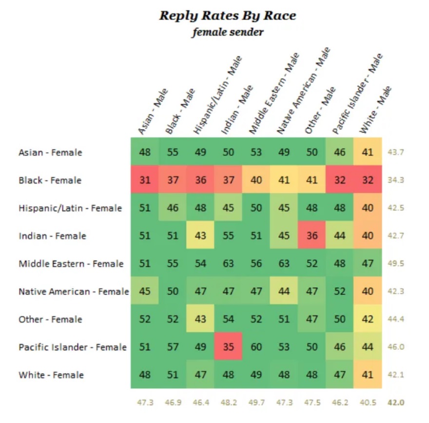 2/ By contrast, only about 1/3 of all men overall will respond to a black woman— the only female demographic with less than a 40% overall response rate.