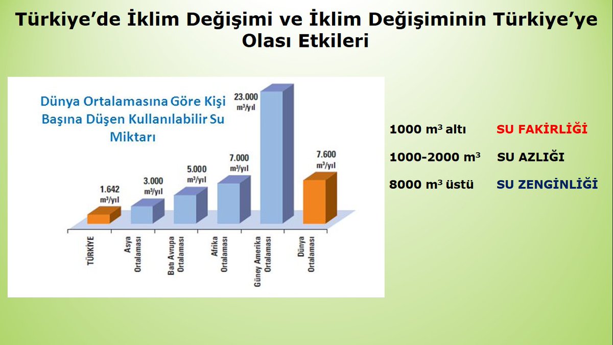 Dünya Yaban Hayatı Fonu’nun (WWF) tahminlerine göre bin 519 metreküp olan kişi başına düşen su miktarının 2030 yılında 100 milyon olması beklenen nüfusla birlikte bin 100 metreküpe düşecek ve Türkiye su fakiri bir ülke haline gelecek.