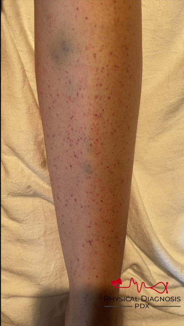 Petechiae are pinpoint hemorrhages <2 mm in size, purpura are 2 mm to 1 cm, and ecchymoses are >1 cm. Our patient has all three. These lesions are the result of extravasation of blood from the vasculature into skin/mucosa and do not blanch, as shown in this video: