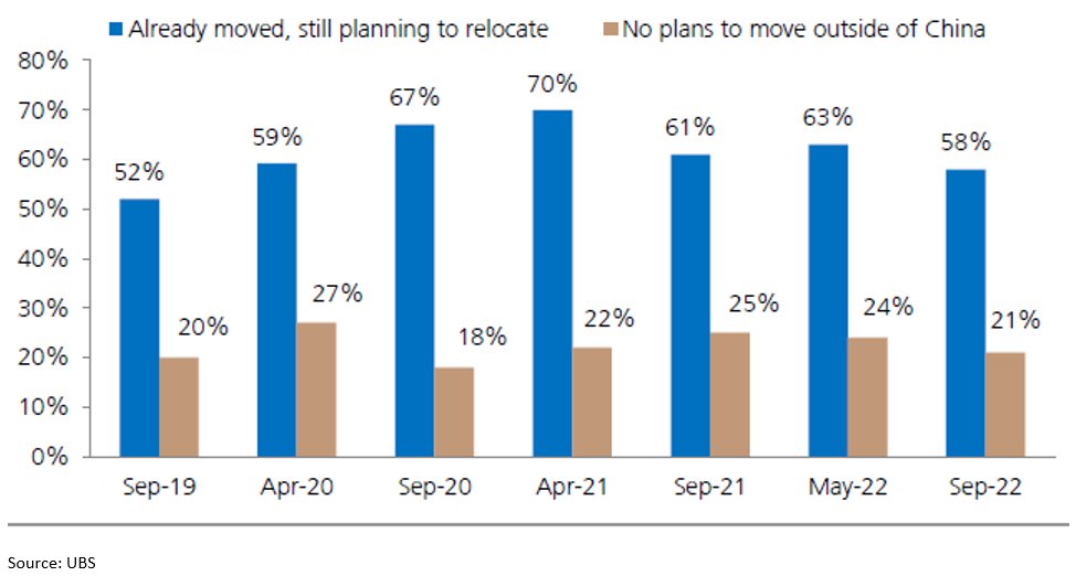 An appreciable share of companies having moved or planning to relocate their factories out of mainland China and India was increasingly seen as a geography to relocate China activity to in the Sep’22 CFO survey