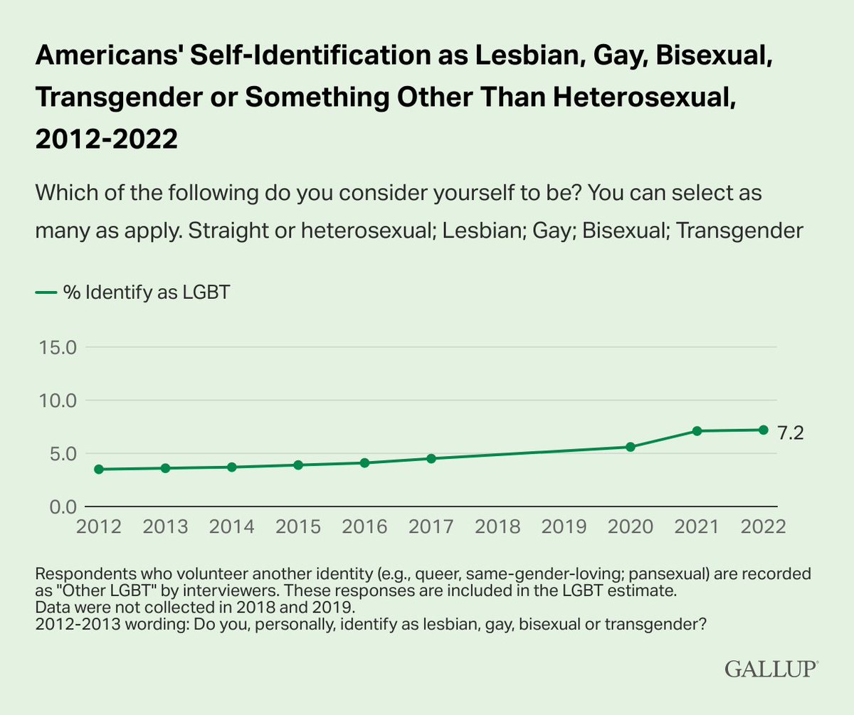 The trans movement has more than doubled the percentage of the US population identifying as non-heterosexual, going up from 3.5% in 2012 to 7.2% in 2022.