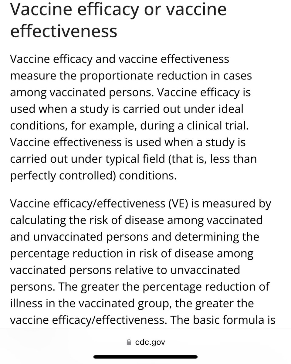 “Vaccine effectiveness is used when a study is carried out under typical field (that is, less than perfectly controlled) conditions.” A vaccine may show efficacy in a clinical trial but be utterly ineffective when introduced at a societal level.