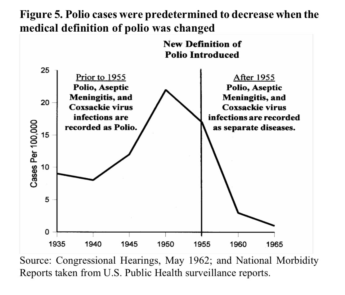 "An even more interesting abuse of statistics becomes apparent when perusing polio statistics. The diagnostic criteria and reporting procedures for the disease changed. In the 1950s, the sophisticated virological techniques of today did not exist. And the technology that existed was rarely available to practicing physicians.”