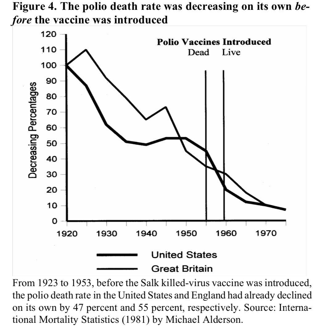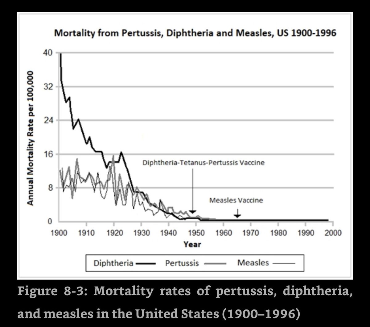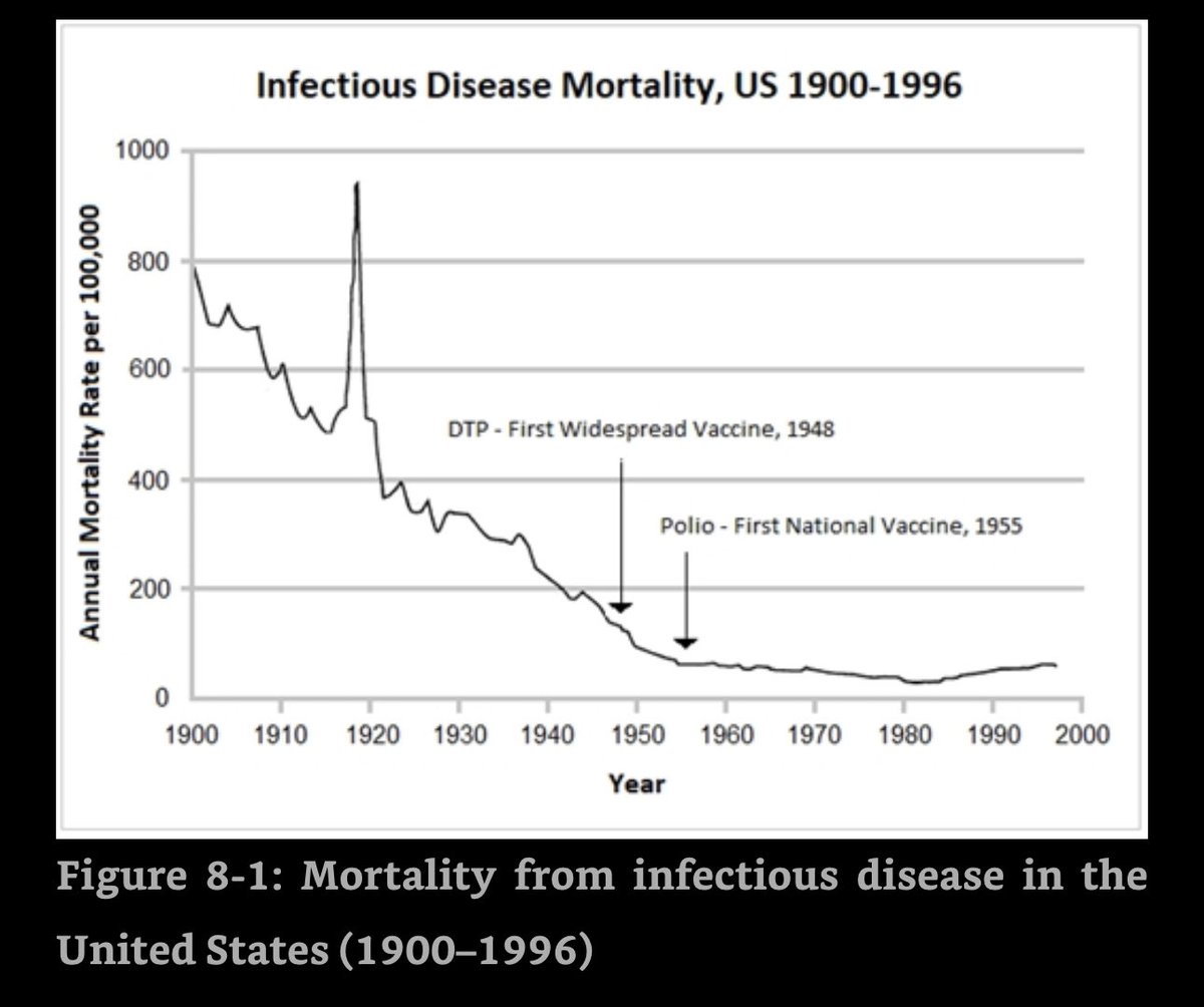 “Nearly 90% of the decline in infectious disease mortality among US children occurred before 1940, when few antibiotics or vaccines were available. […] Vaccination,” they conclude, “does not account for the impressive declines in mortality seen in the first half of the century”