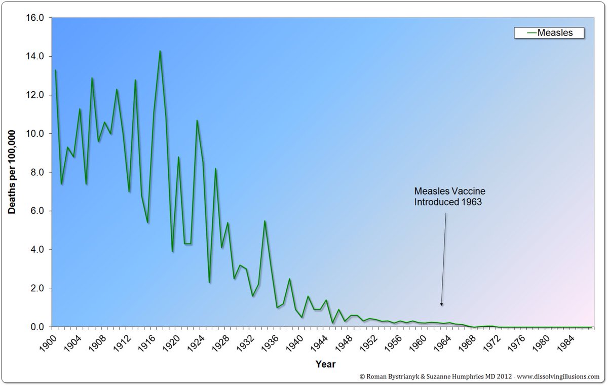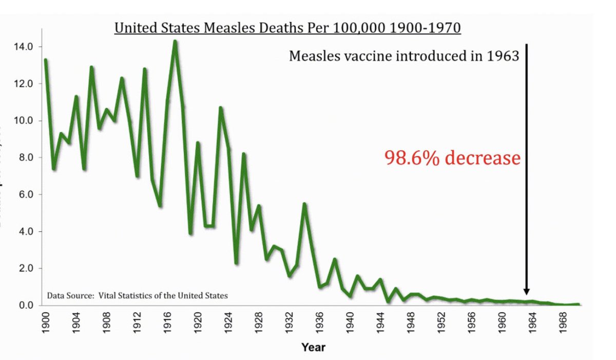 Measles mortality dropped almost 99% by 1963, the year measles vaccination commenced in the United States.
