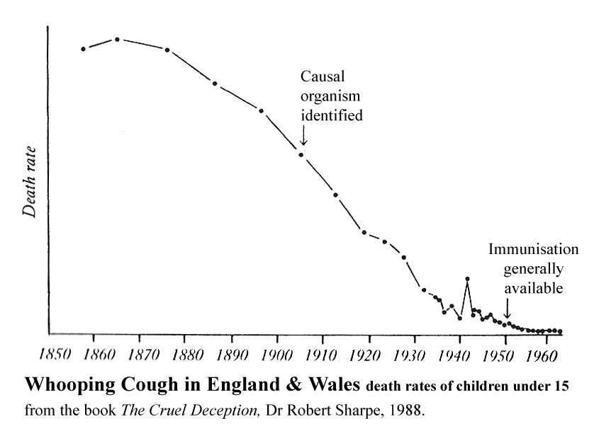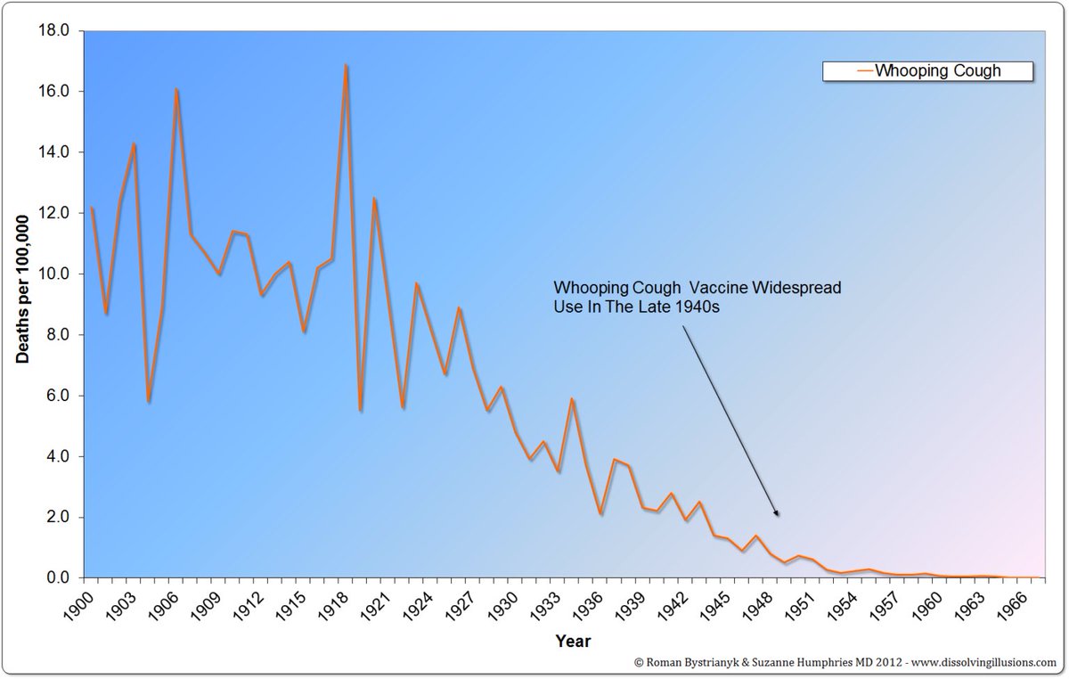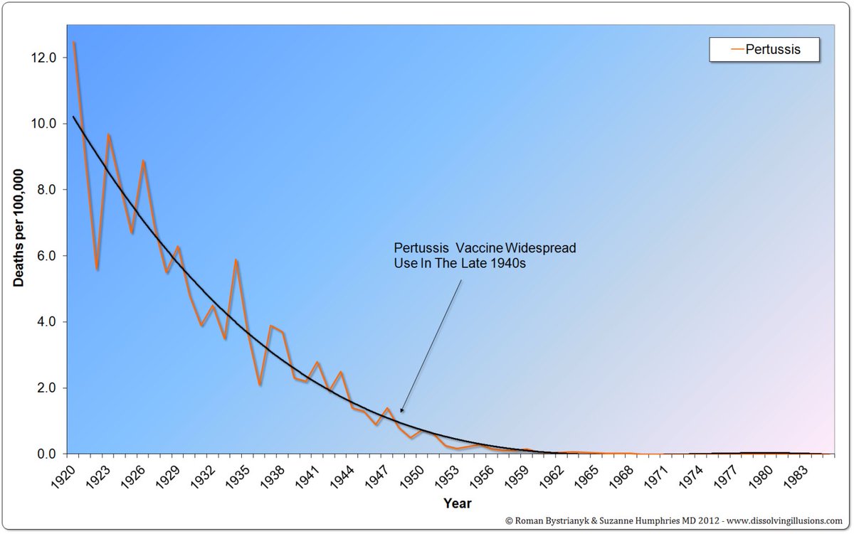 A chart showing the mortality rate in free fall before the introduction of the vaccines and the subsequent increase before disappearing in the 1960’s